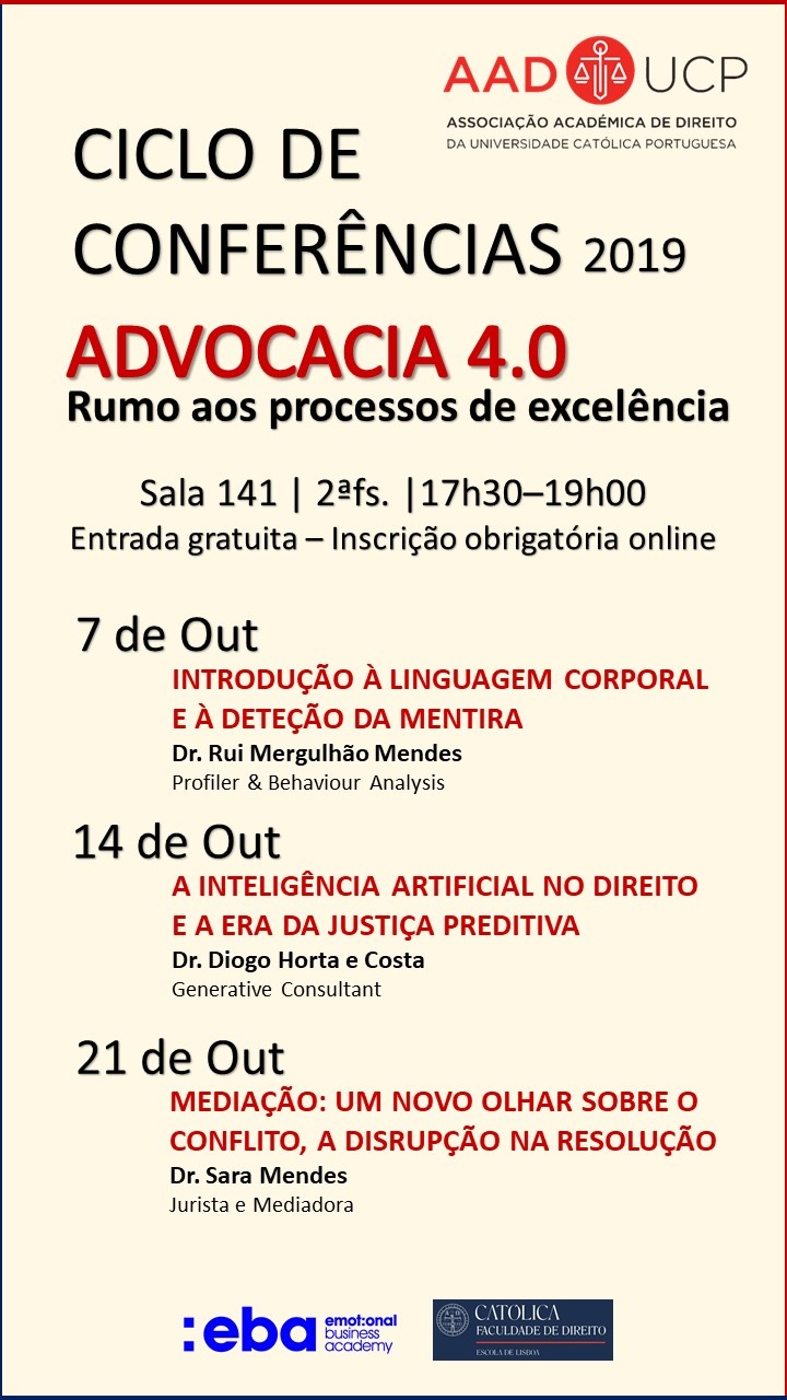 O Departamento de Seminários e Conferências da AAD-UCP, em parceria com a Emotional Business Academy, promove o Ciclo de Conferências ADVOCACIA 4.0 - Rumo aos Processos de Excelência.