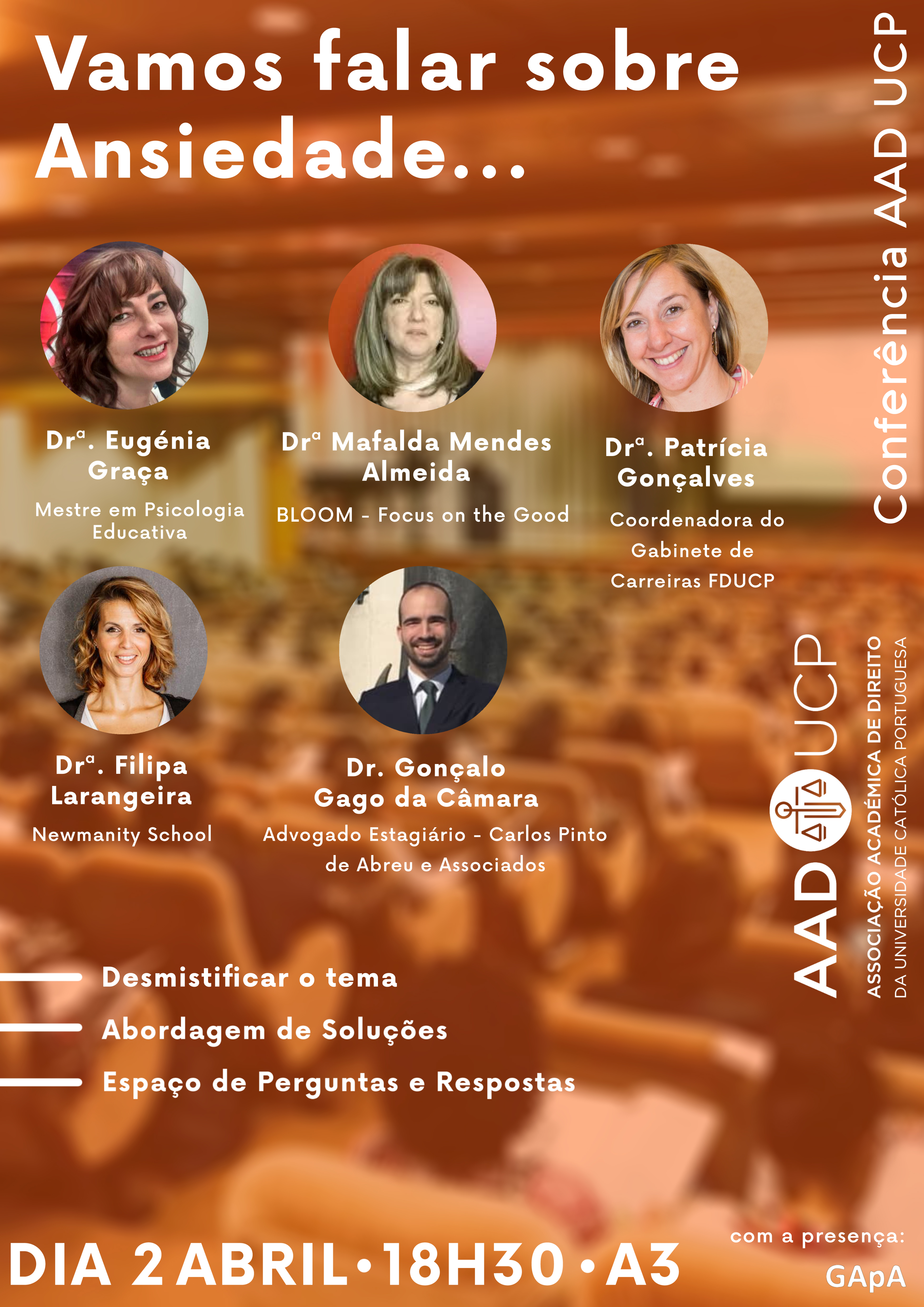 Sob a organização da AAD UCP, terá lugar a conferência "Vamos Falar de Ansiedade", onde vai procurar-se encontrar soluções e desmistificar o tema , havendo espaço para um momento de perguntas e respostas.
