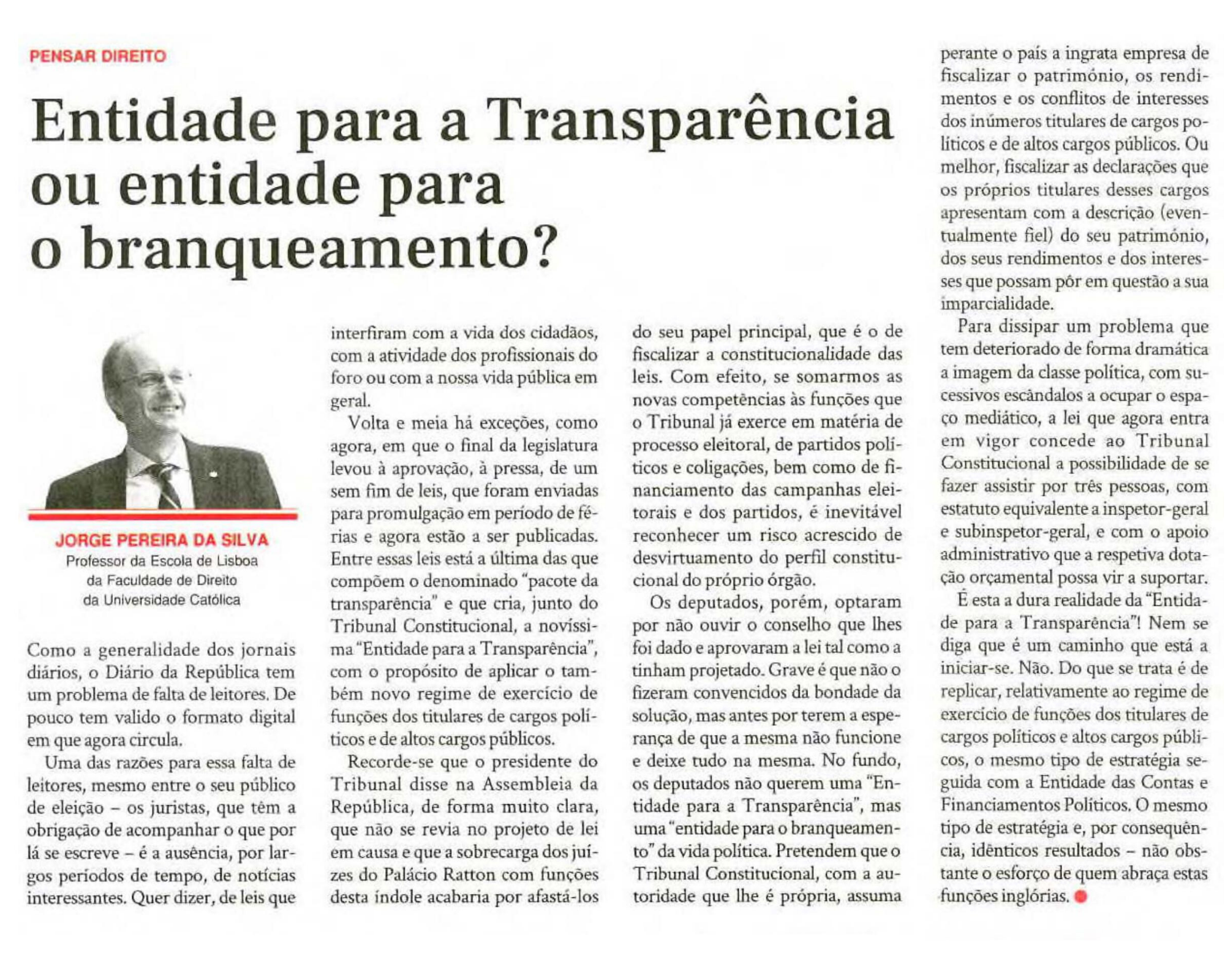 Os deputados, porém, optaram por não ouvir o conselho que lhes foi dado e aprovaram a lei tal como a tinham projetado. Grave é que não o fizeram convencidos da bondade da solução, mas antes por terem a esperança de que a mesma não funcione e deixe tudo na mesma. No fundo, os deputados não querem uma "Entidade para a Transparência", mas uma "entidade para o branqueamento" da vida política. Pretendem que o Tribunal Constitucional, com a autoridade que lhe é própria, assuma perante o país a ingrata empresa de fiscalizar o património, os rendimentos e os conflitos de interesses dos inúmeros titulares de cargos políticos e de altos cargos públicos. Ou melhor, fiscalizar as declarações que os próprios titulares desses cargos apresentam com a descrição (eventualmente fiel) do seu património, dos seus rendimentos e dos interesses que possam pôr em questão a sua imparcialidade.